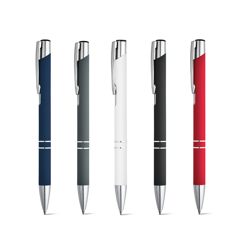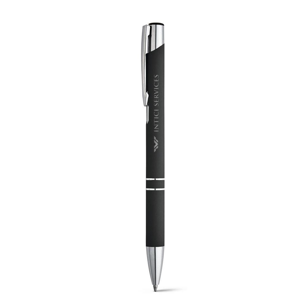 Esferográfica em alumínio com acabamento emborrachado e clipe de metal. Escrita em preto até 1.5 km. ø10 x 137 mm