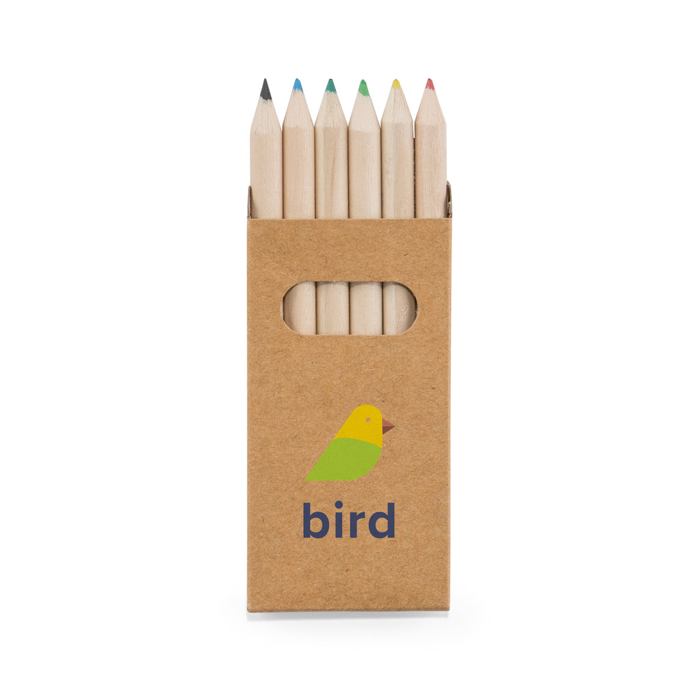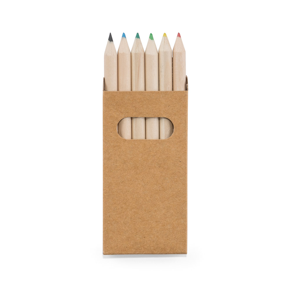 Caixa de papel kraft reciclado com 6 mini lápis de cor. Produto certificado de acordo com a portaria Inmetro nº423 de 8/out/2021. 45 x 90 x 9 mm