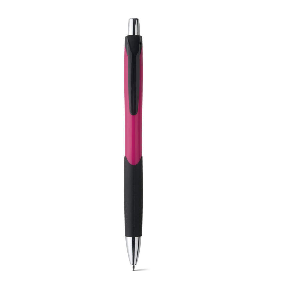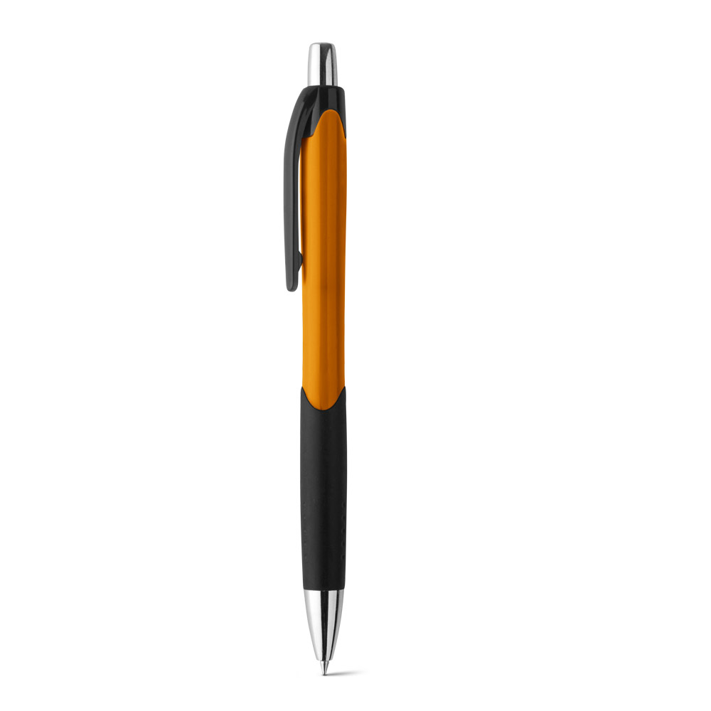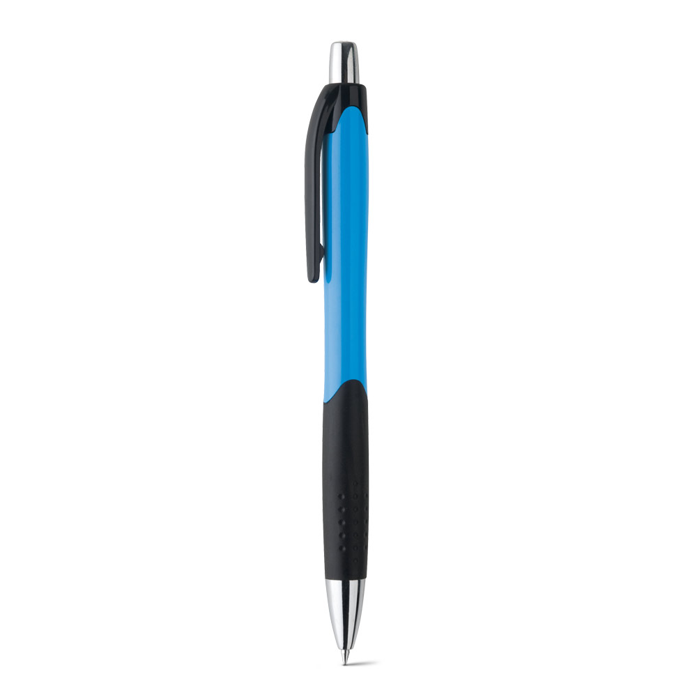 Esferográfica em ABS com grip, acabamento brilhante e ponteira cromada. Escrita em azul até 1.5 km. Produto certificado de acordo com a portaria Inmetro nº423 de 8/out/2021. ø10 x 138 mm