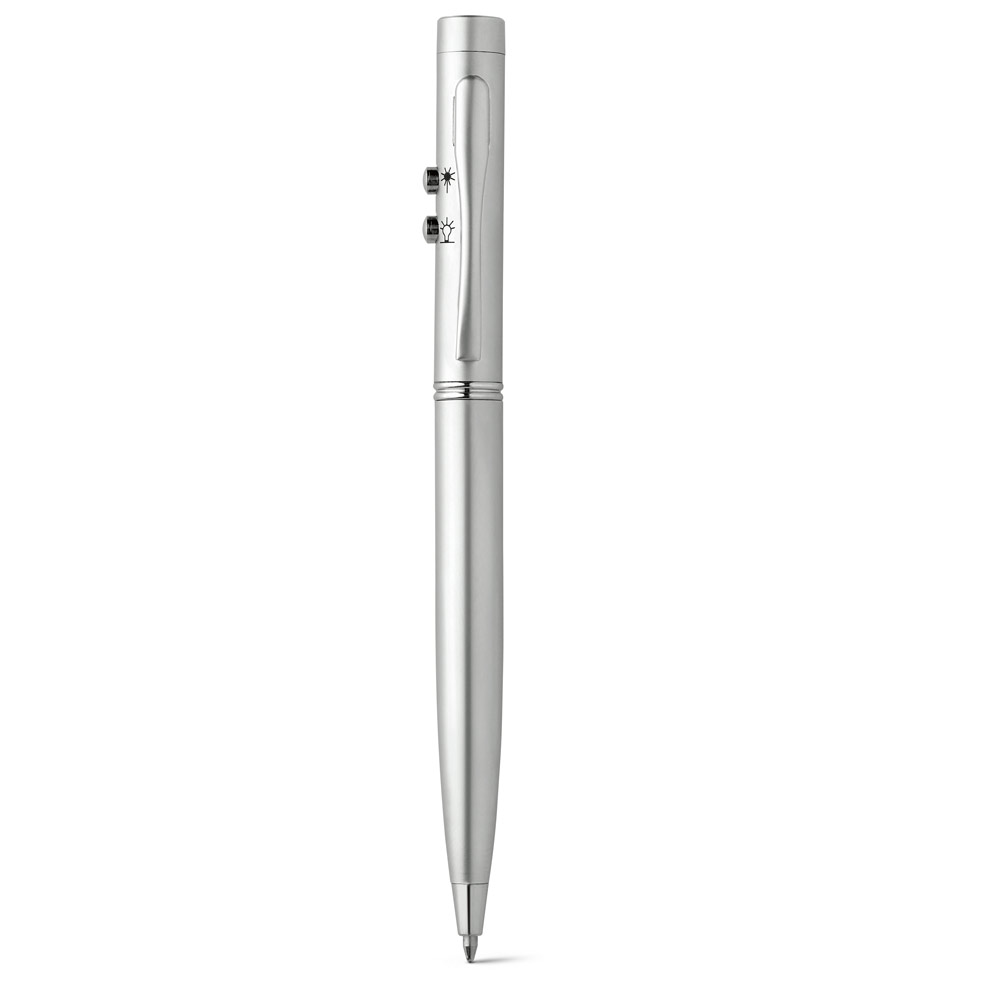 Esferográfica em metal, com ponteira laser e LED. Incluso 3 pilhas LR41. Escrita em azul até 1.5 km. Fornecida em estojo com forro de veludo. ø10 x 131 mm | Estojo: 170 x 50 x 20 mm