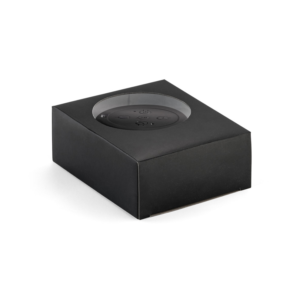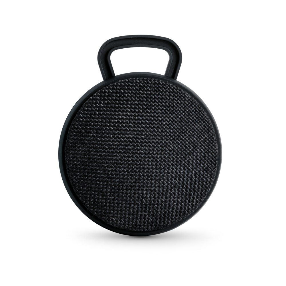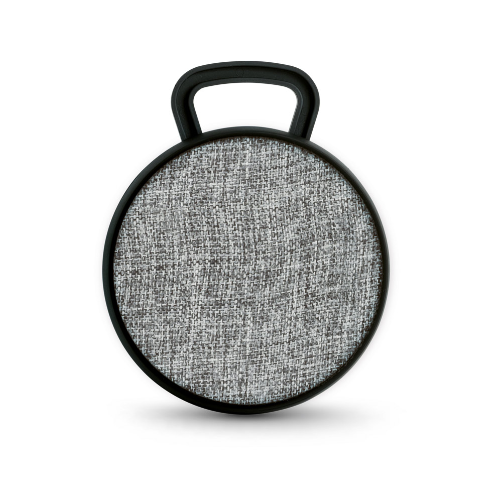 Caixa de som portátil em ABS, tecido em poliéster e acabamento emborrachado. Transmissão sem fios BT v42, potência de 3W/4Ω e autonomia, aproximada, de 3 h. Contém um gancho para facilitar o transporte e arrumação. Devido a seu microfone incorporado, permite atender chamadas, controle de volume e conexão à playlist do dispositivo móvel. Incluso cabo para carregamento. Fornecida em caixa presente. ø90 x 40 mm | Caixa: 115 x 95 x 45 mm