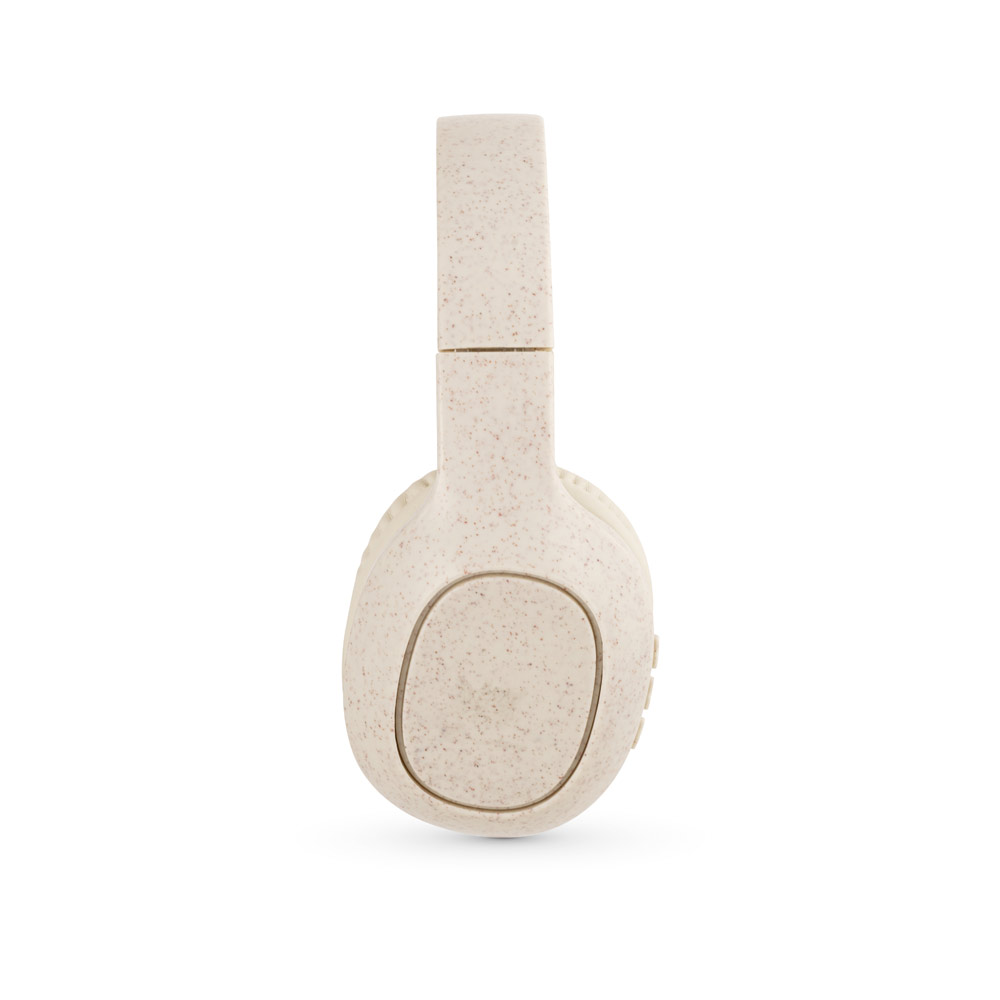 Fone de ouvido dobráveis wireless em fibra de palha de trigo e ABS. Potência de 32 mW e transmissão BT v50 com alcance até 10m. Bateria com capacidade de 400mAh e autonomia, aproximada, de 13 horas. Incluso porta AUX, slot para cartão microSD e cabo de carregamento USB-C. Botões de controle com +/- e ligar/desligar. Fornecido em caixa presente de papel kraft reciclado. A cor e o resultado da impressão nos materiais naturais pode variar entre produtos. Fones de ouvido (fechados): 185 x 185 x 74 mm | Caixa: 120 x 90 x 160 mm