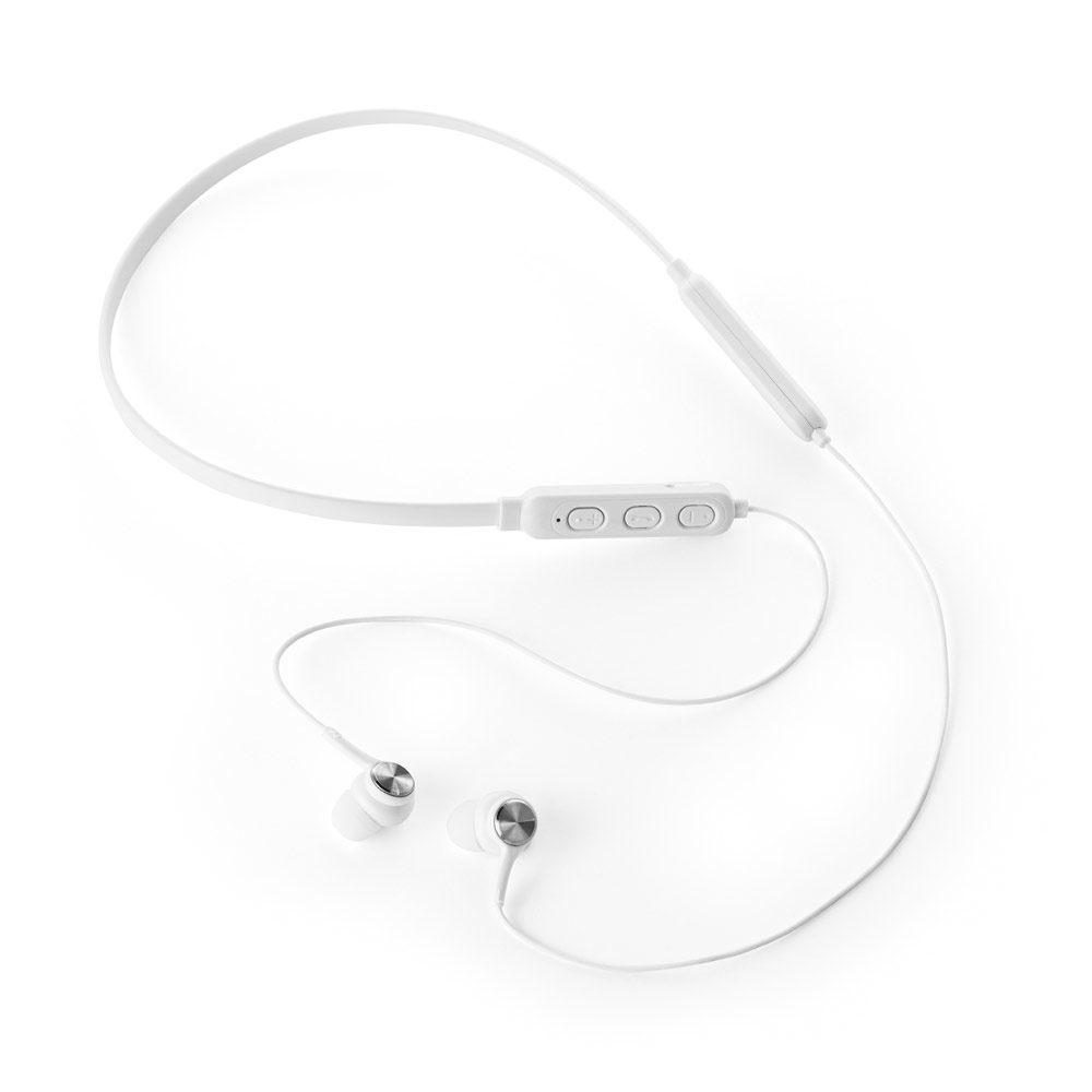 Fone de ouvido em PC. Transmissão sem fios BT v50 com banda para pescoço com autonomia aproximada de 7 horas. Função para atender chamadas, controle de volume e conexão à playlist do dispositivo móvel. Incluso cabo USB / micro USB para carregar. Fornecido em bolsa em non-woven. 190 x 200 mm