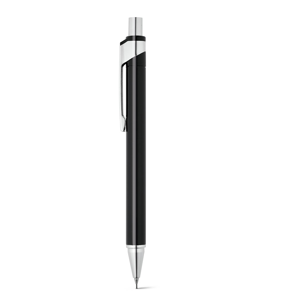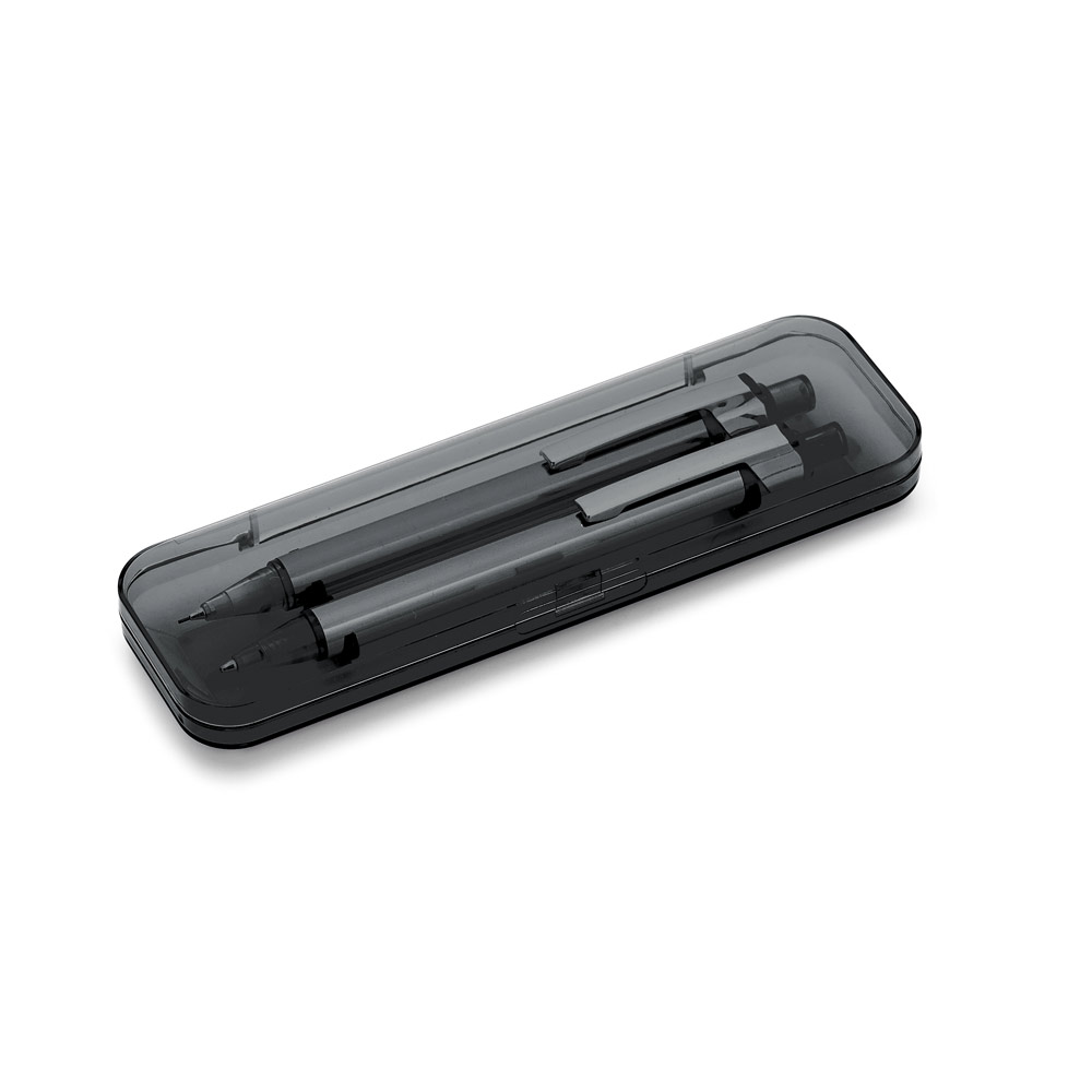 Conjunto de esferográfica e lapiseira em alumínio. Escrita em azul até 1.5 km. Lapiseira com grafite 05 mm. Incluso estojo. ø11 x 137 mm | Estojo: 165 x 50 x 24 mm