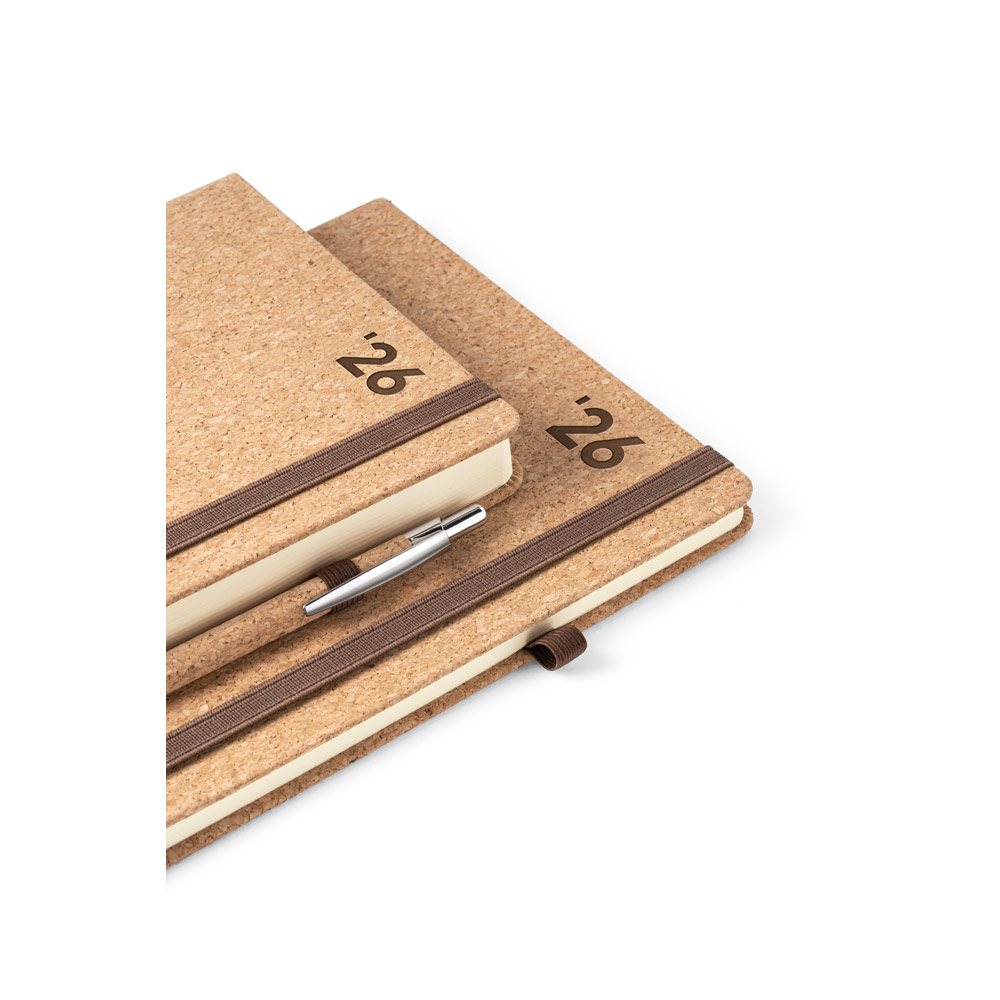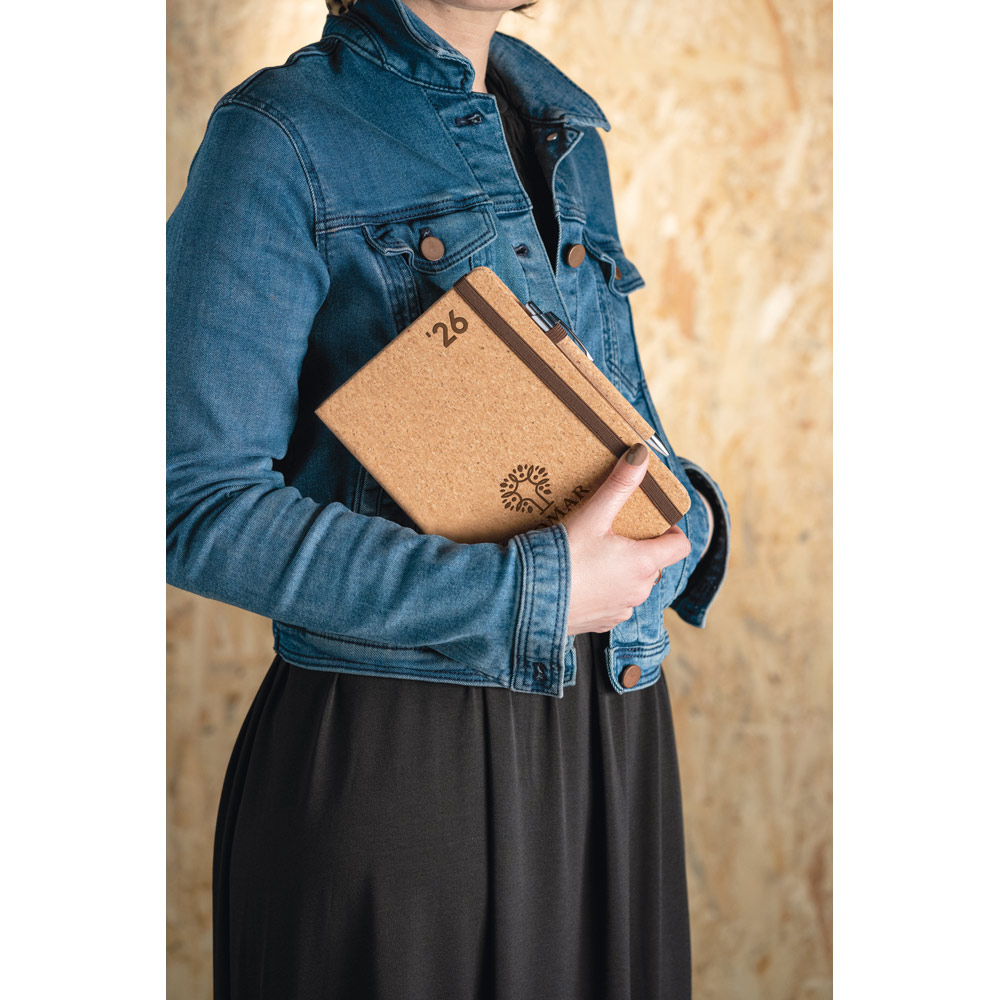 Agenda A5 em cortiça. Possui um suporte para esferográfica (não inclusa), miolo em cor marfim e marcador em fita. Está organizada num plano diário. Fornecida em bolsa de non-woven. 148 x 210 mm | Bolsa: 205 x 250 mm