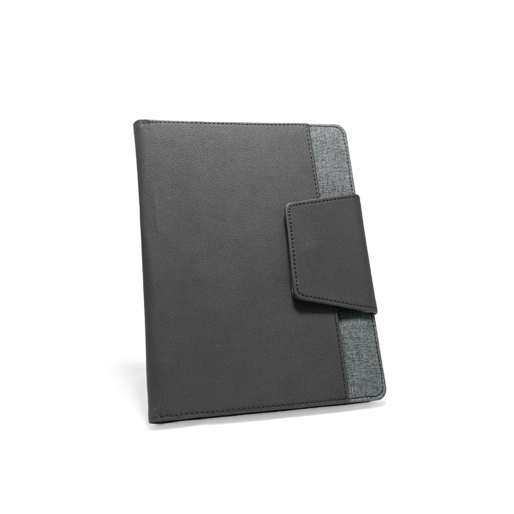 Capa em c. sintético e tecido em poliéster com caderno A5 removível com 160 páginas lisas. Contém fecho magnético, bolso exterior, bolso interior e suporte para esferográfica (não inclusa). Fornecida em embalagem de non-woven. 155 x 215 mm | Bolsa: 205 x 250 mm