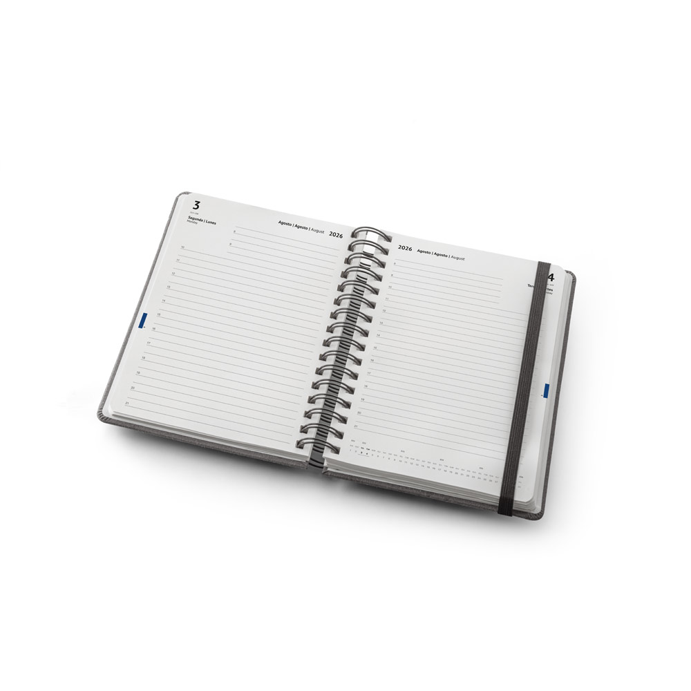 Agenda A5, com argolas, em pele (58% reciclada). Possui um elástico para fecho da agenda. Está organizada num plano diário. 148 x 210 mm