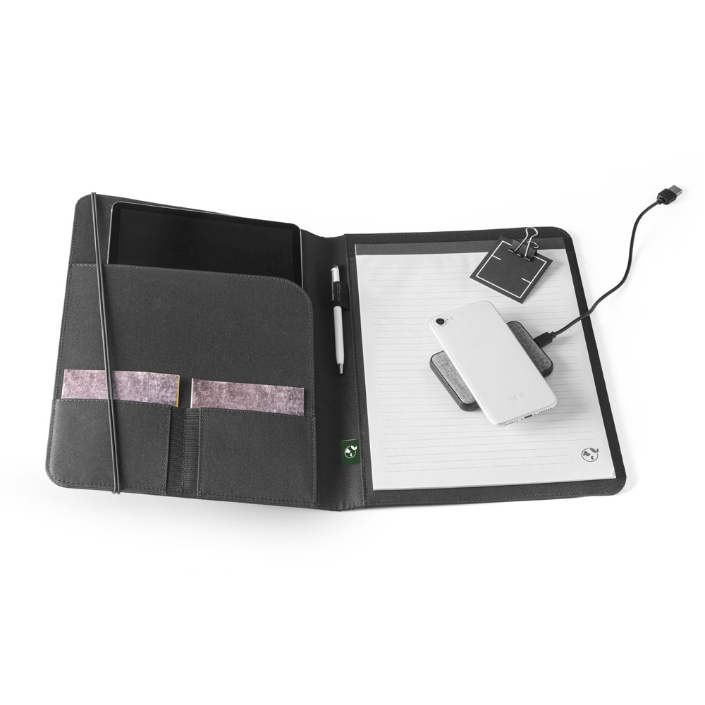 Pasta A4 em 300D poliéster 100% reciclado, com elástico para fecho. O interior contém vários bolsos, suporte para esferográfica (não inclusa) e um caderno com 40 páginas pautadas, em papel proveniente de gestão florestal. Fornecida em bolsa non-woven. 230 x 330 x 50 mm