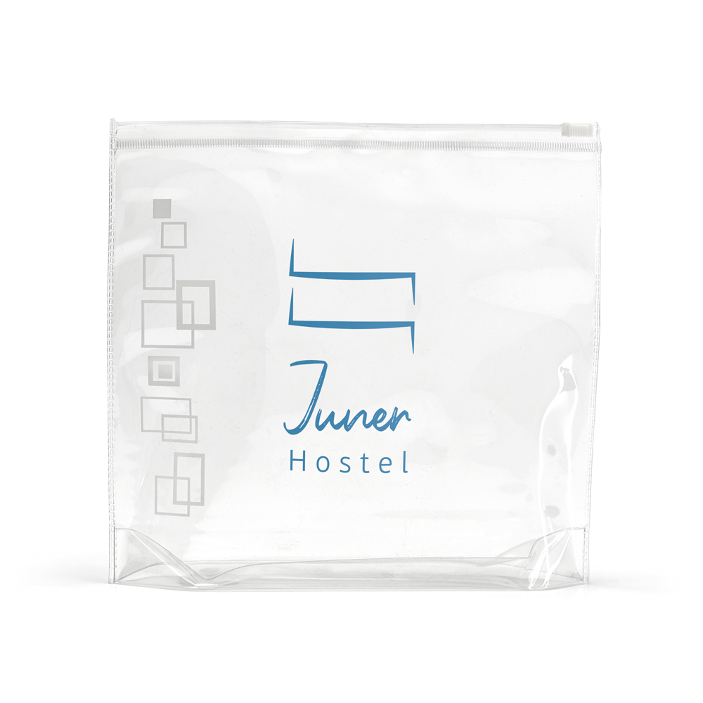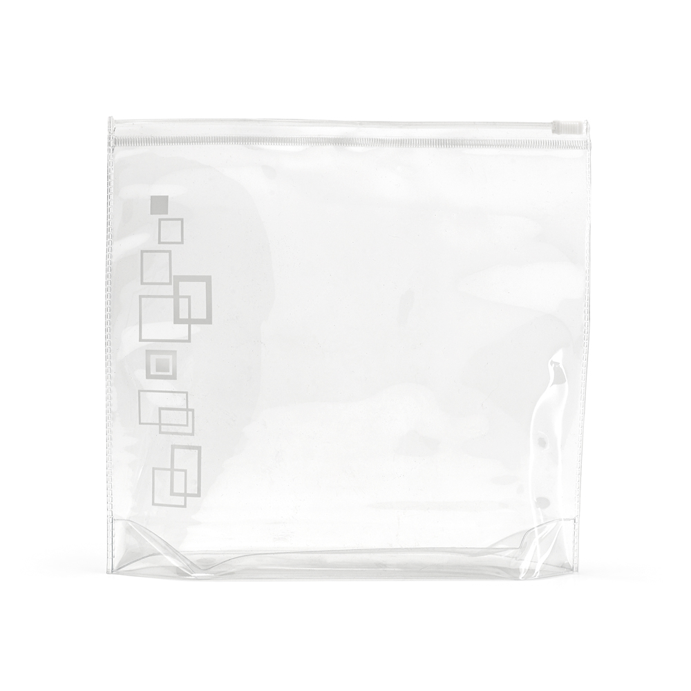 Bolsa de cosméticos hermética em PVC. Apropriada para transporte em cabine de avião. Frascos não inclusos. 165 x 185 x 40 mm | Capacidade < 1 Litro