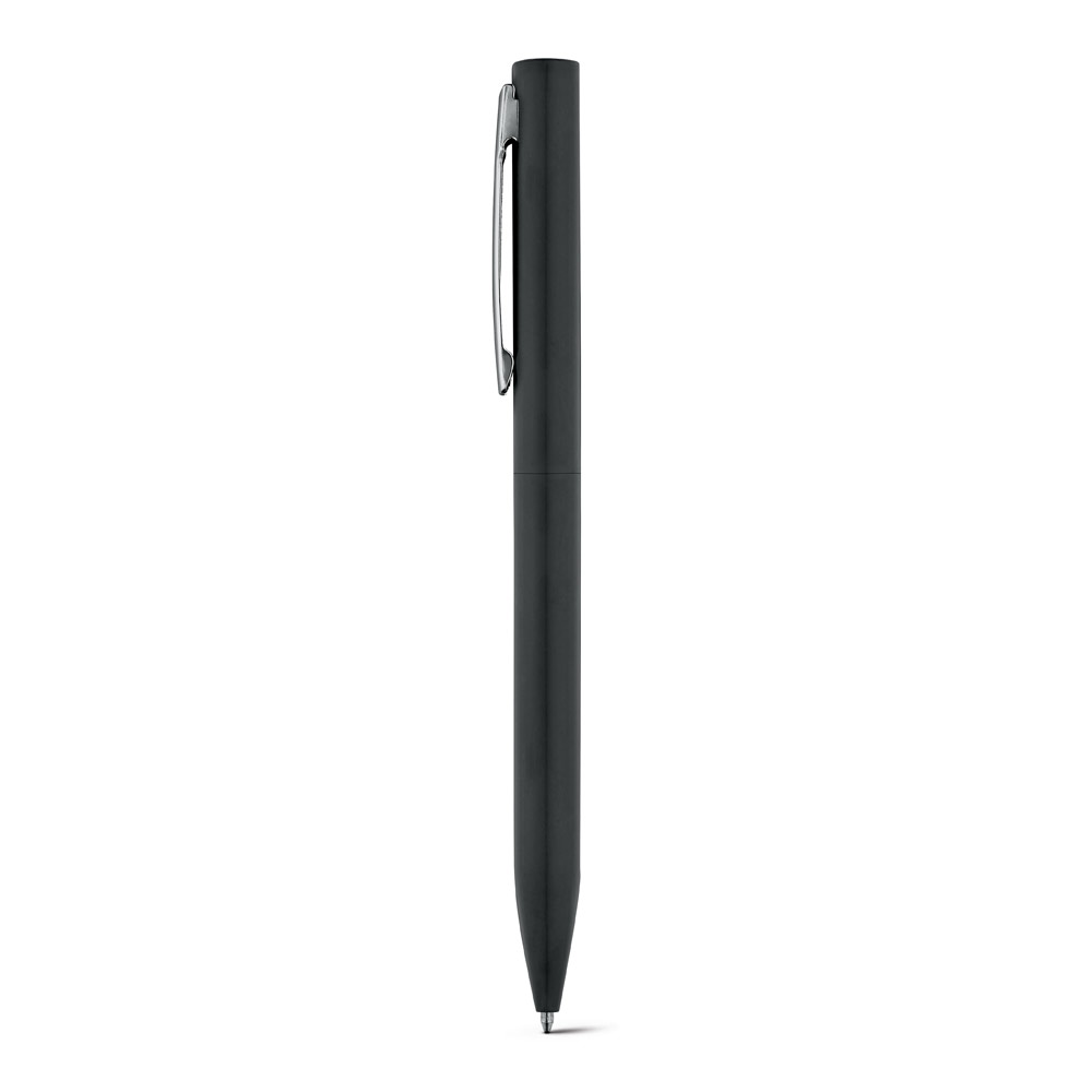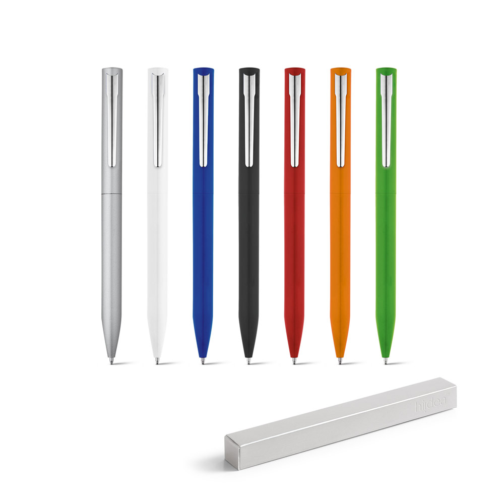 Esferográfica em alumínio com clipe em ferro com cromagem brilhante. A esferográfica tem mecanismo twist e escrita em azul até 1.5 km. Fornecido com estojo presente desmontado. ø10 x 138 mm | Caixa: 175 x 41 x 20 mm